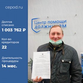 Списано долгов на 1 млн. р. за 14 месяцев. Кол-во кредиторов - 22 шт.